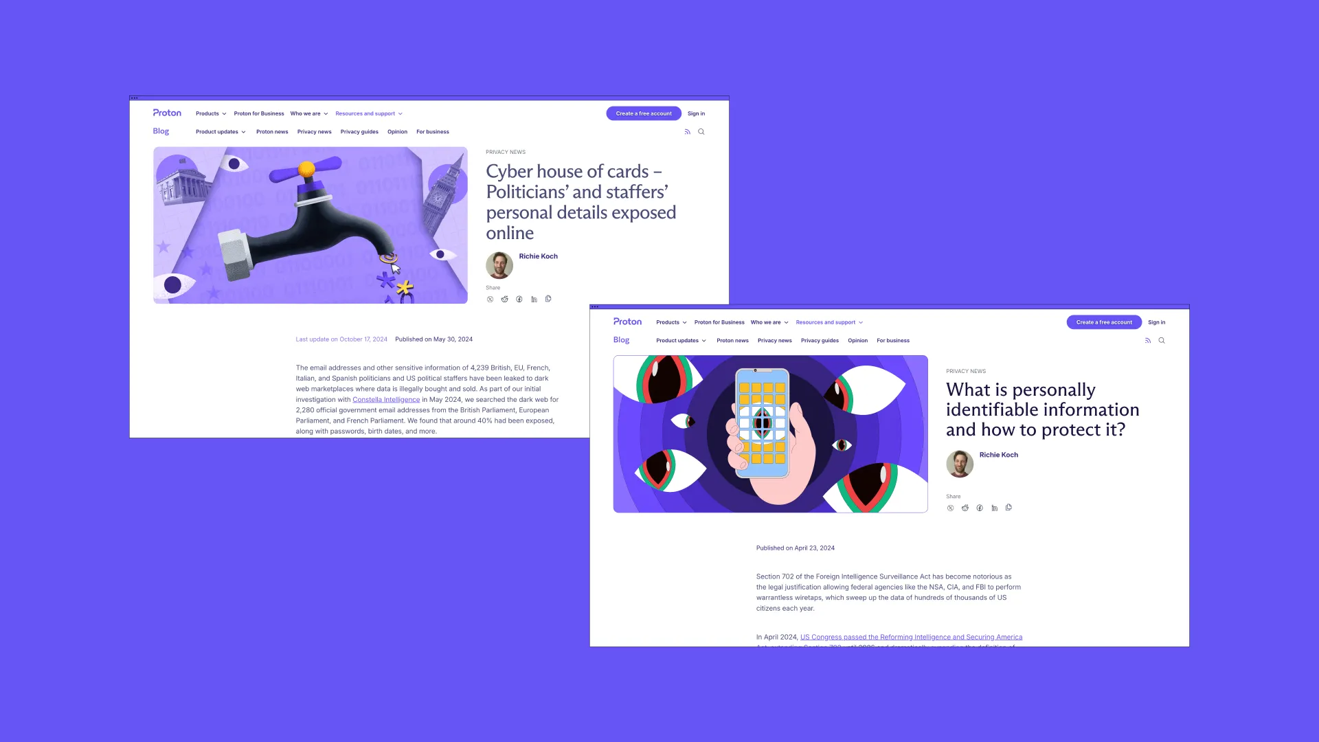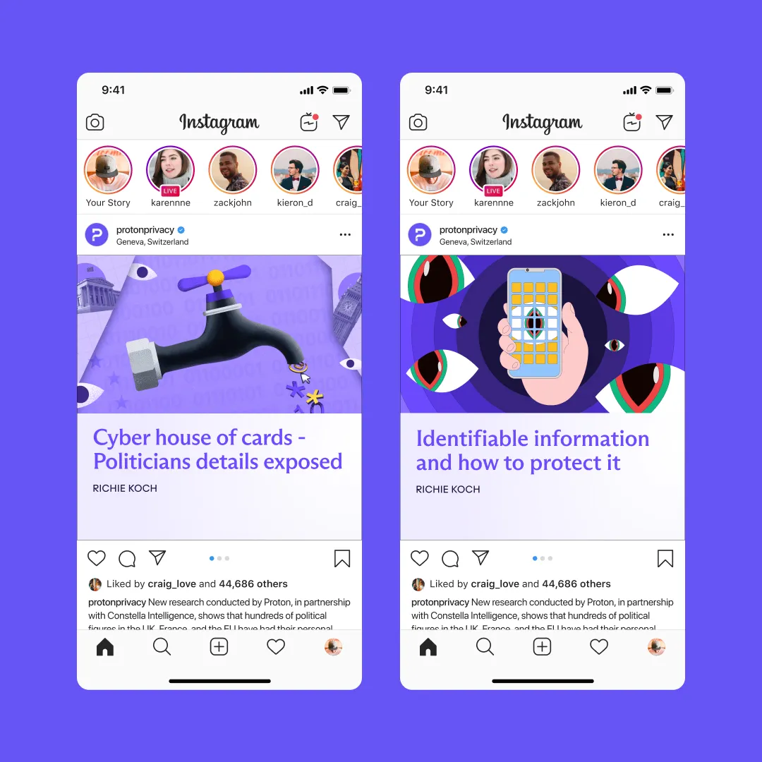 I was tasked by Proton to create artwork for a set of blog posts highlighting data leaks and the poor cyber security habits of UK and EU government officials. They wanted to try some graphic approaches that differed from their typical style, with the aim of casting more eyes onto their social channels.
